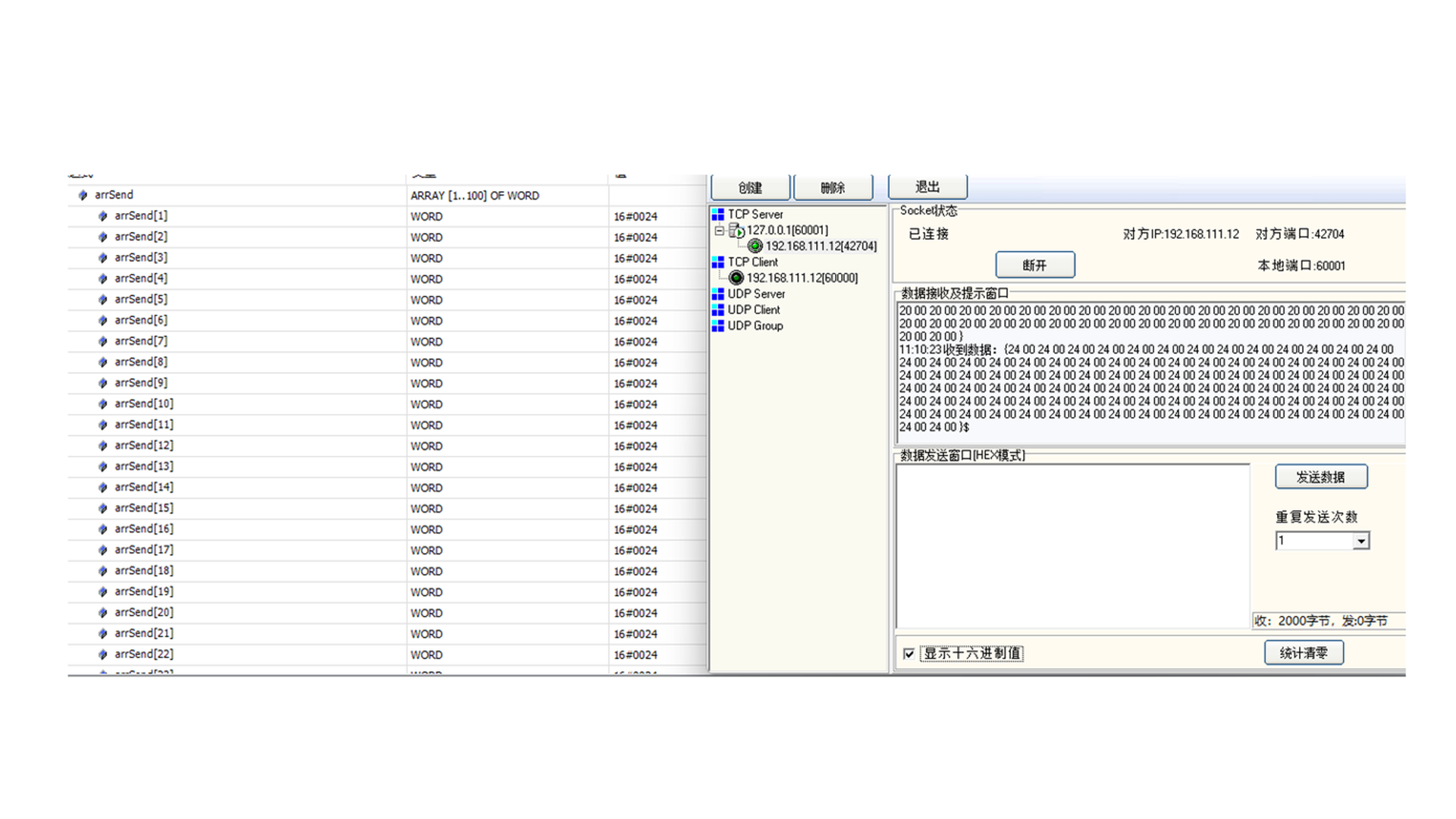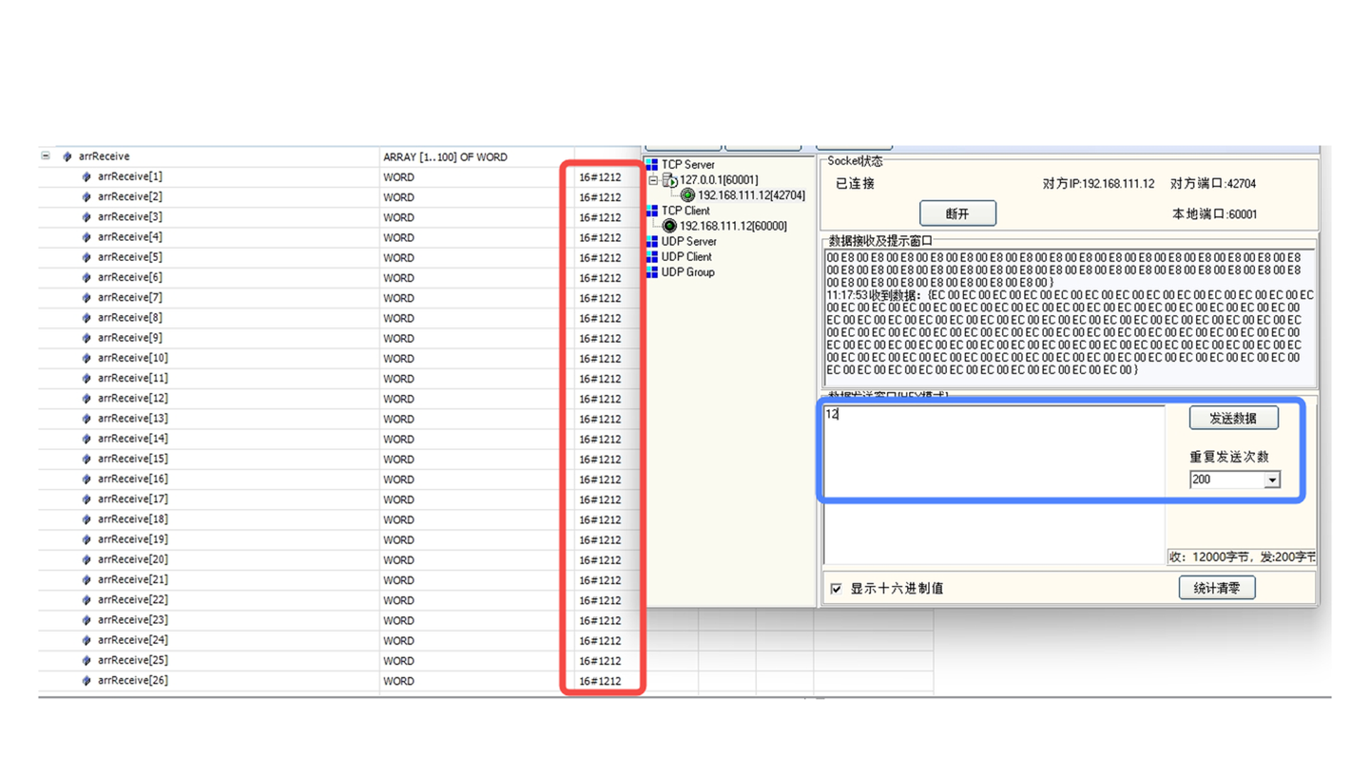 触发TCPIP CLient的fbSoccketSend的bExecute上升沿触发发送数据;第三方TCPIP Server接收到数据;