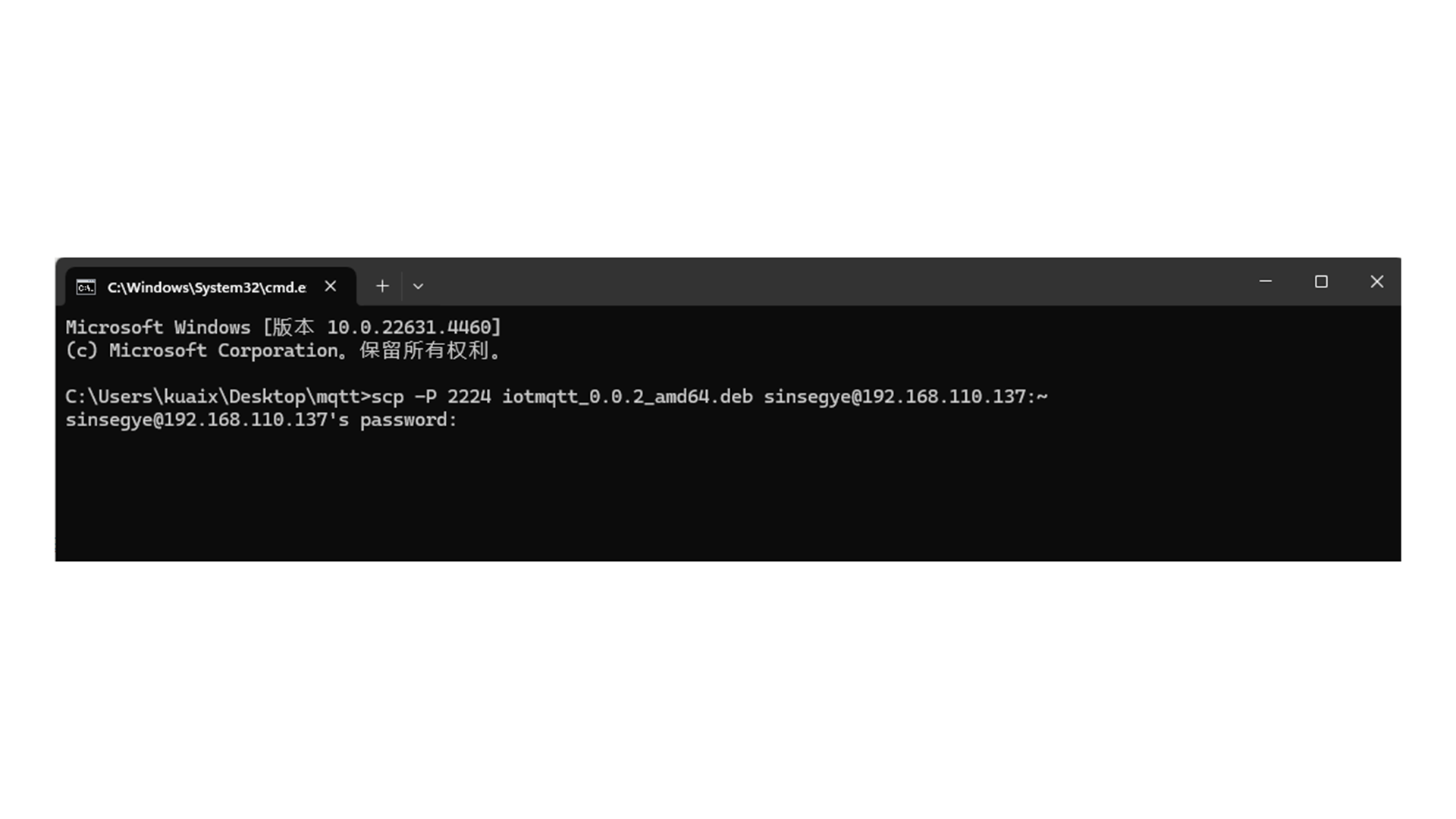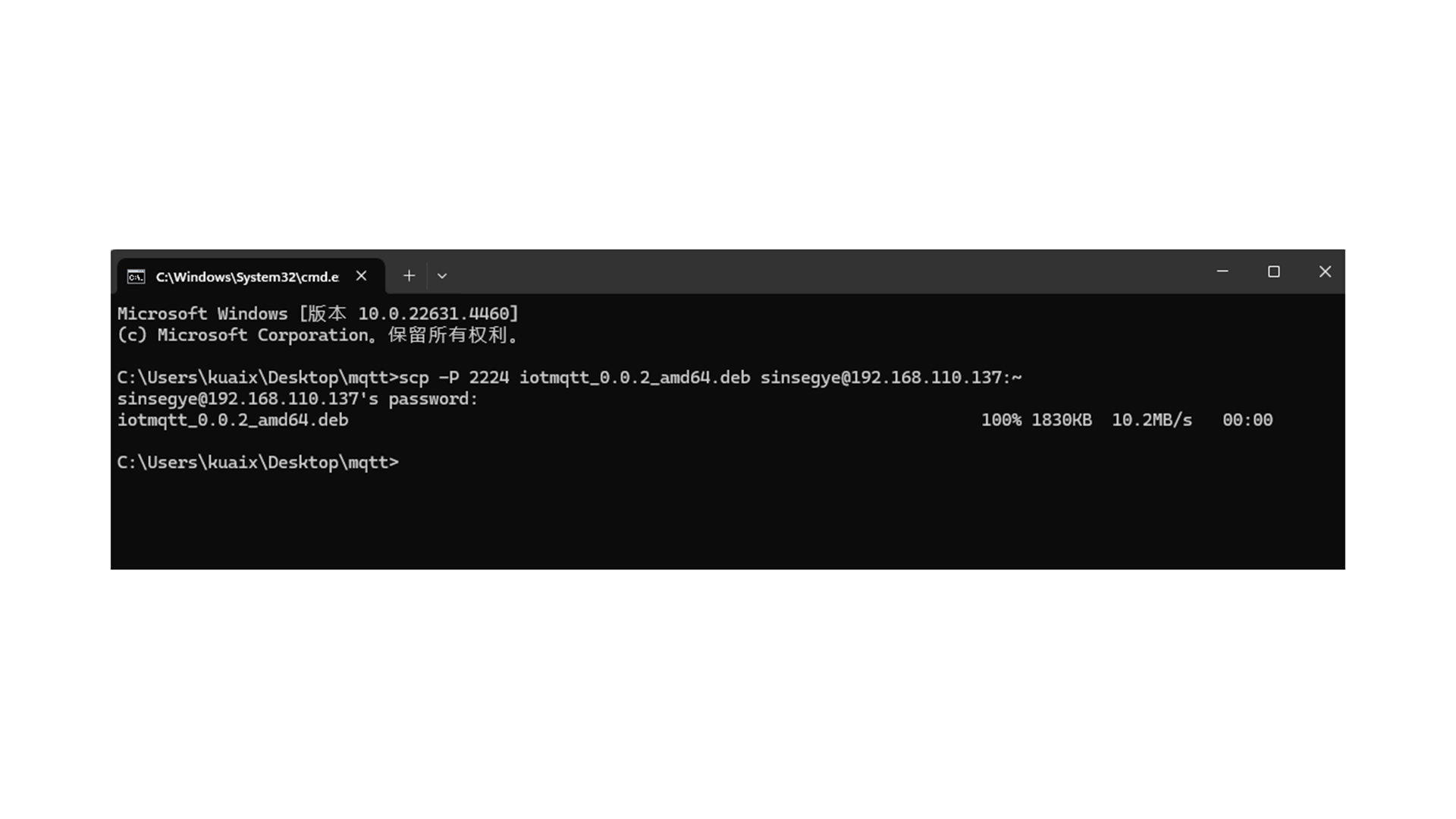 4.通过scp命令将iotmqtt_0.0.2_amd64.deb文件传输到客户端工智机中。