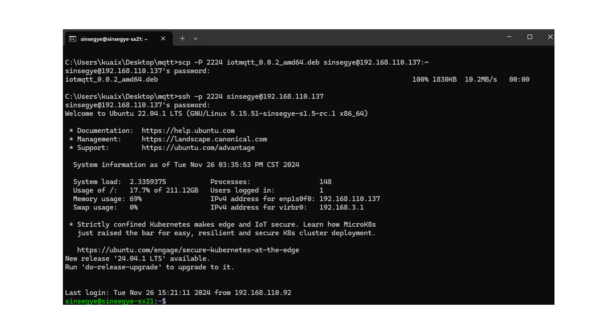 scp -P 2224 iotmqtt\_0.0.2\_amd64.deb sinsegye@192.168.110.137:\~