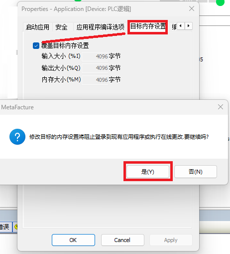 6.点击“目标内存设置”—勾选“覆盖目标内存设置”—点击“是”