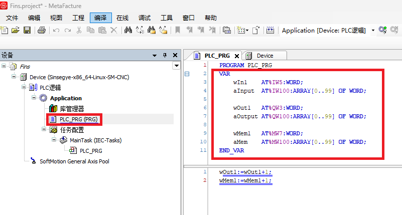 8.打开程序PLC_PRG,新建变量映射至%I、%Q、%M