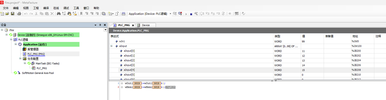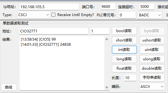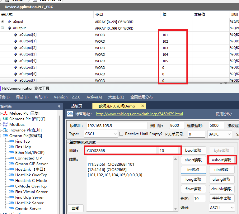 9. 读取PLC中aOutput[0]数据,%Q区的起始地址为CIO32767,在PLC中aOutput[0]映射地址为%QW100,所以aOutput[0]对应CIO32868