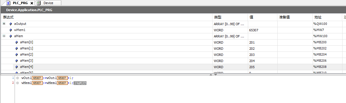 | aMem[0]-- aMem [4] | 201,202,203,204,205 |