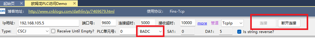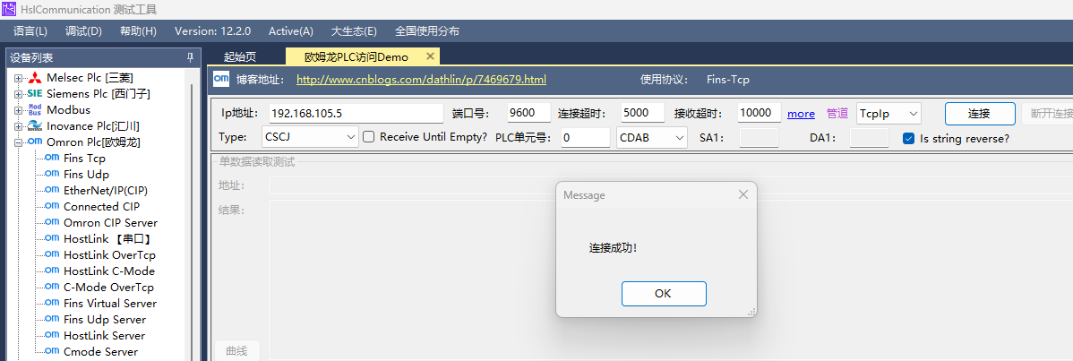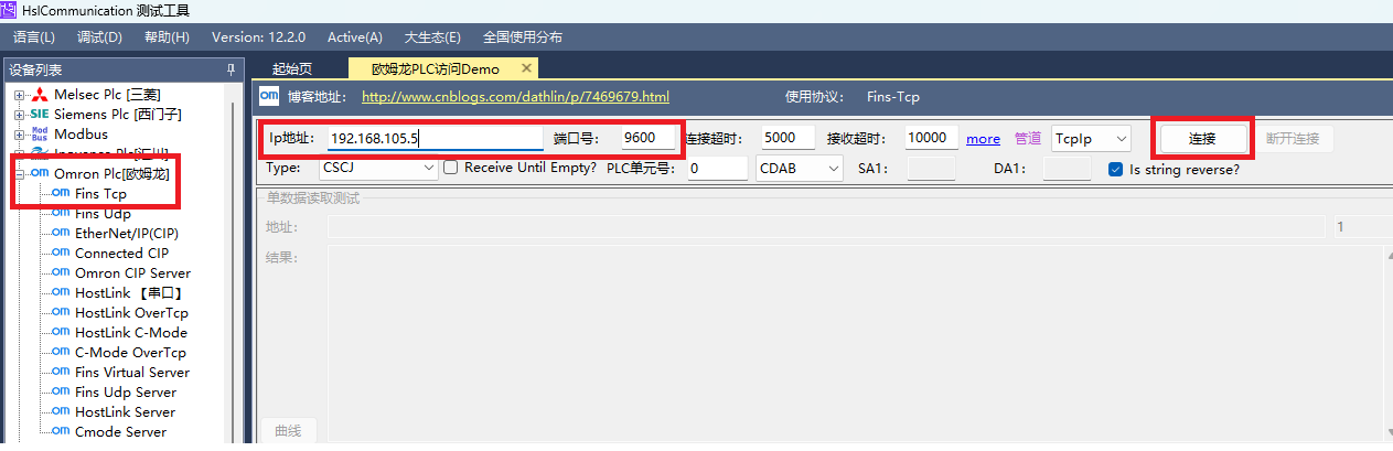 11.打开HslCommunication测试工具,选择Omron—Fins Tcp—输入IP地址(本例为192.168.105.5),默认端口号为9600,点击“连接”