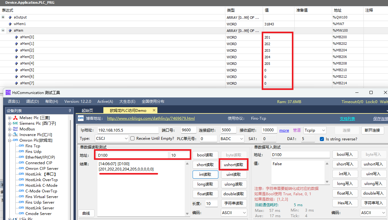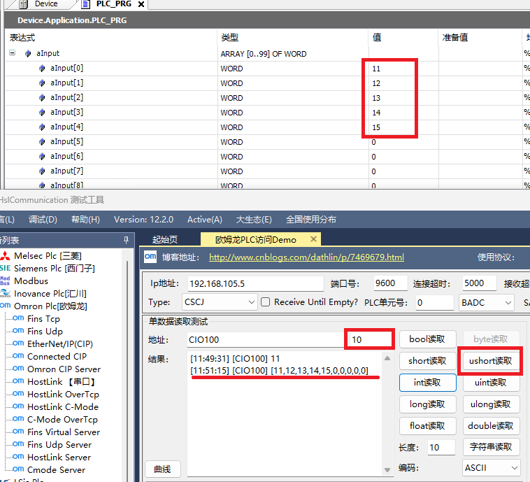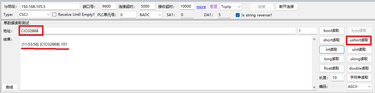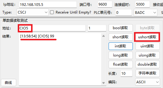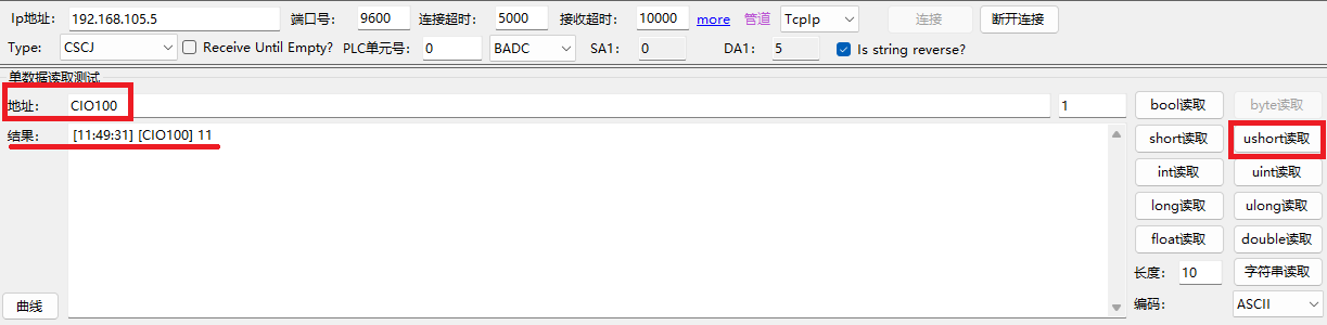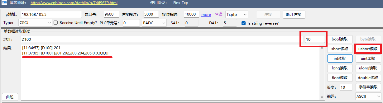 5.读取PLC的aMem数组,对应Fins的D100数据,选择“ushort读取”: