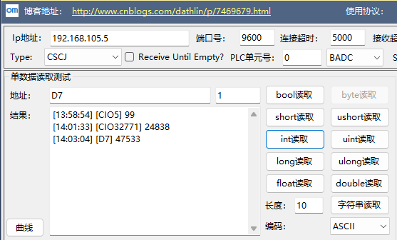 6.批量读取D100~D109,数量修改为10,点击“ushort读取”