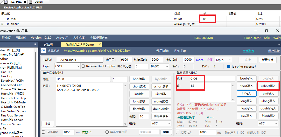 写入wIn1数据,写入地址为CIO5,修改值为88