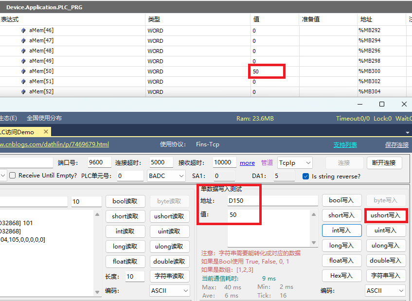 内存%M区写入,aMem[50]对应D150,写入数据50,点击“ushort写入”。