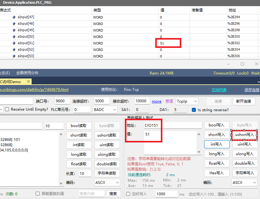 输入%I区写入, aInput[51]对应CIO151,写入数据51,点击“ushort写入”。