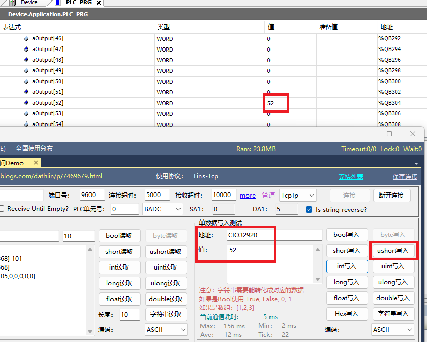 输入%Q区写入, aOutput[52]对应CIO32920,写入数据52,点击“ushort写入”。