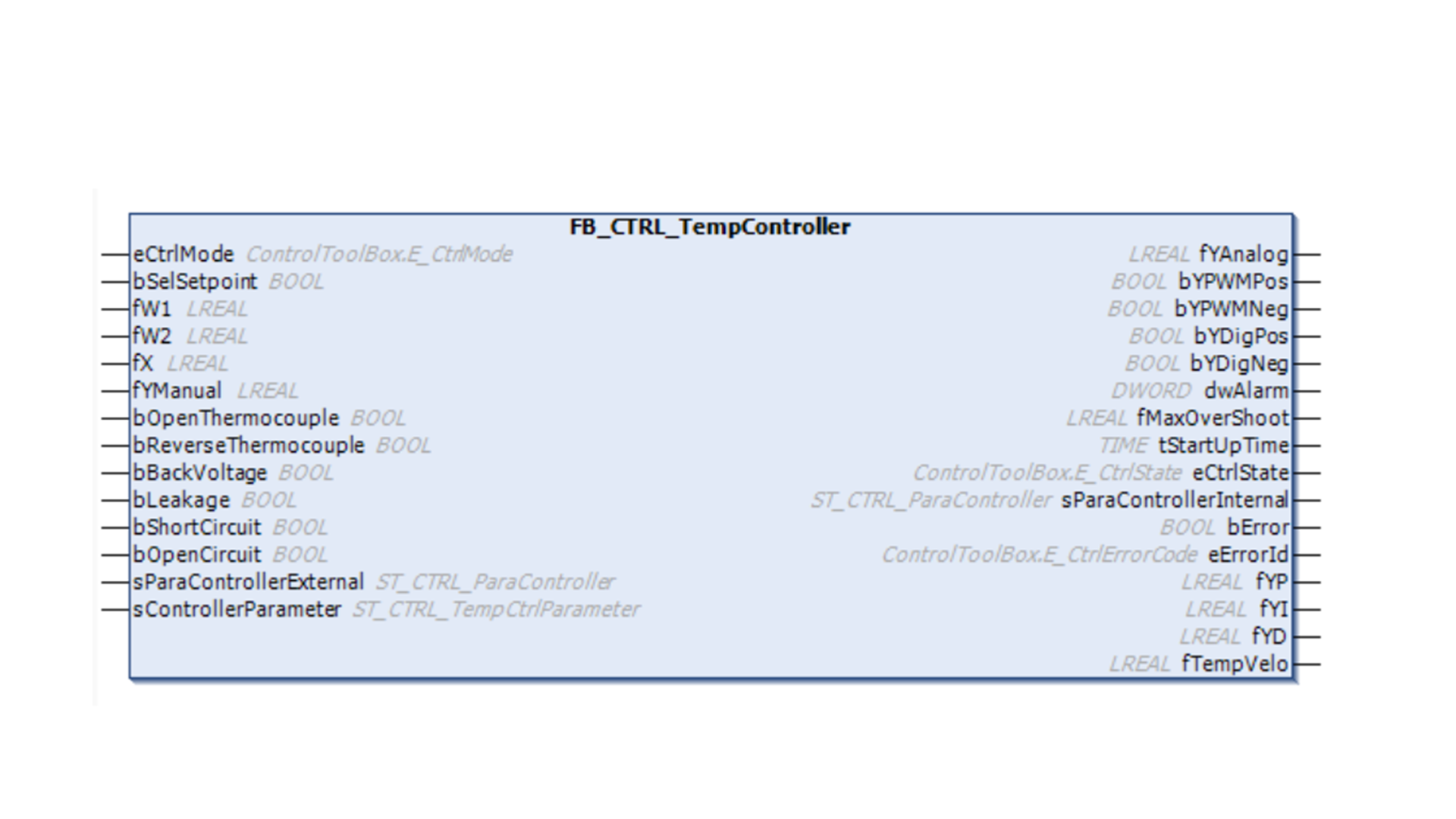温度控制器功能块 FB_CTRL_TempController 具有多个输入和输出,具体描述如下。所有控制器的参数均通过结构体传递给功能块。