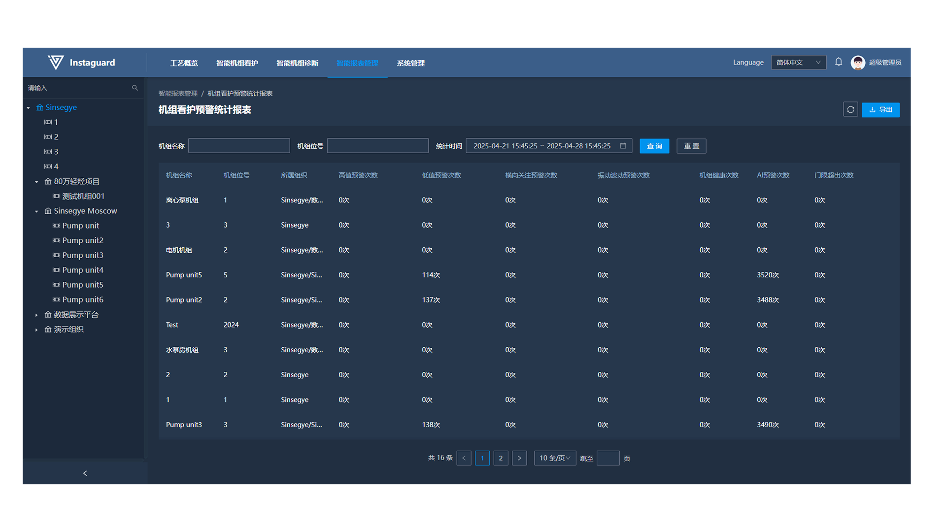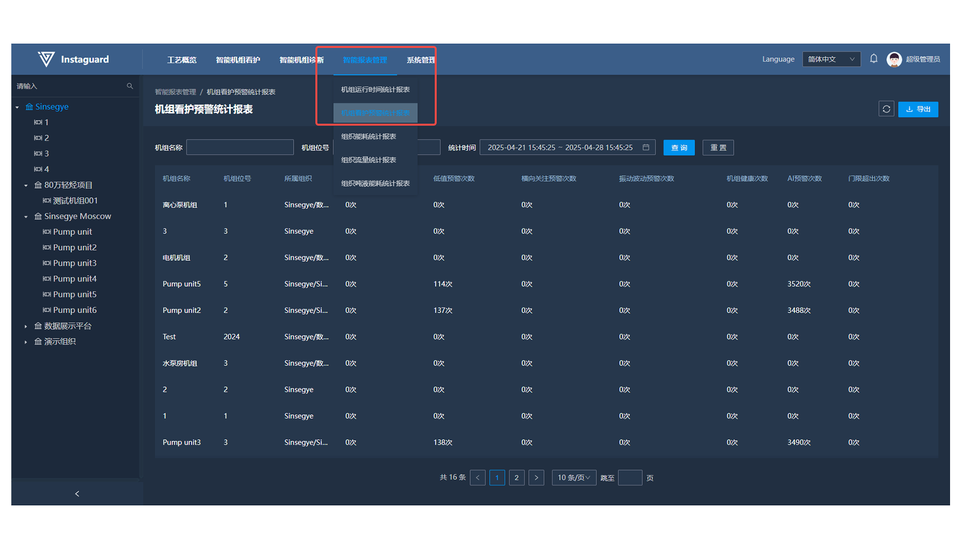 「智能报表管理」→「机组看护预警统计报表」