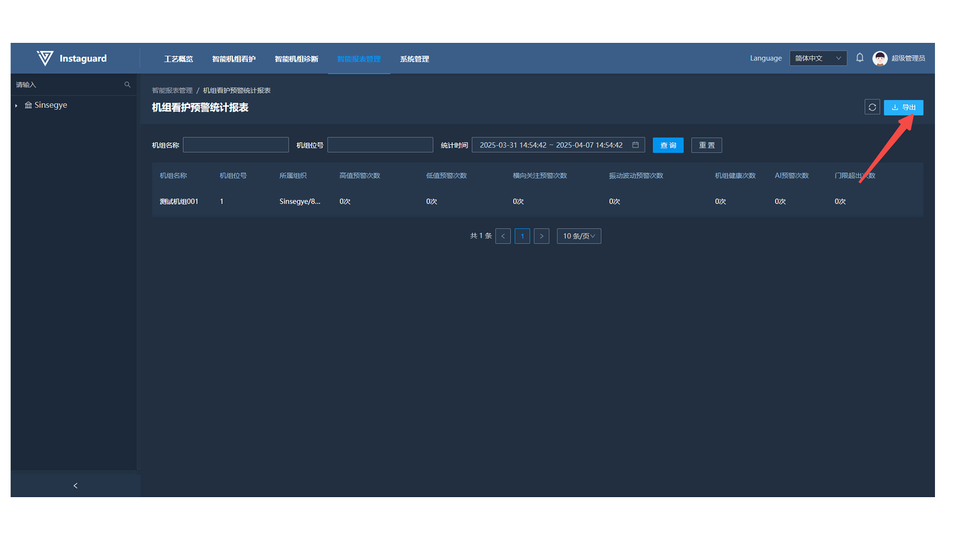 进入报表后,点击右上角的导出按钮即可完成当前显示数据的导出。导出格式为xls,文件名称为:机组看护预警统计报表