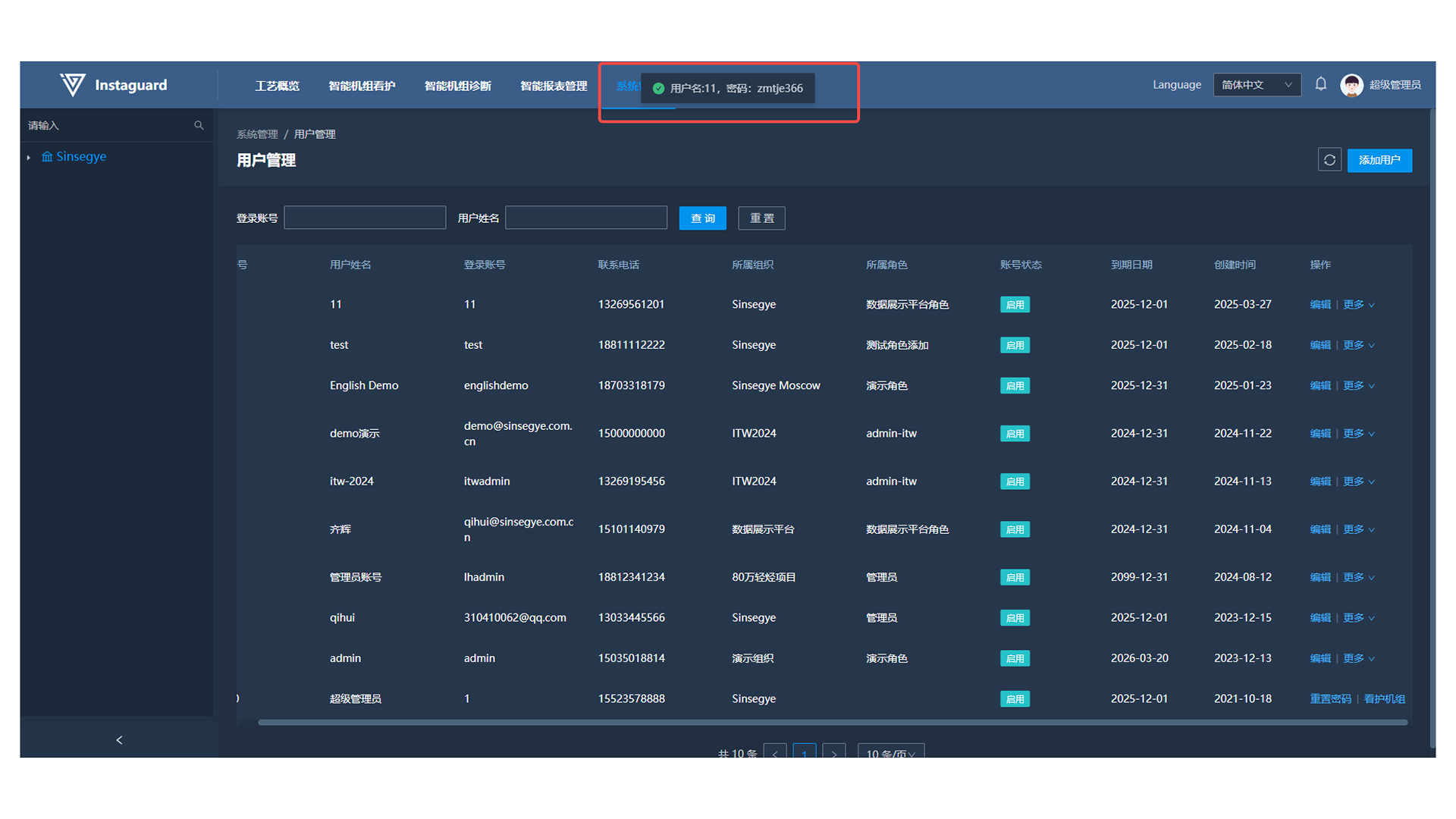 添加时,用户的登录账号全网唯一,长度至少大于8位。保存后弹出添加用户密码,客户管理员可自行将用户名及密码告知相关人员