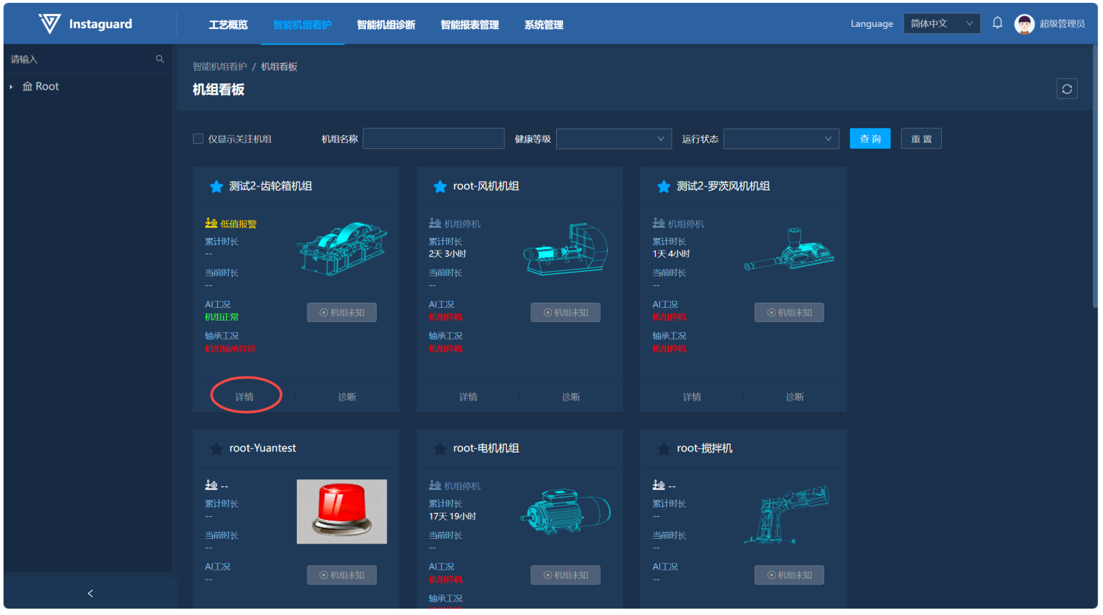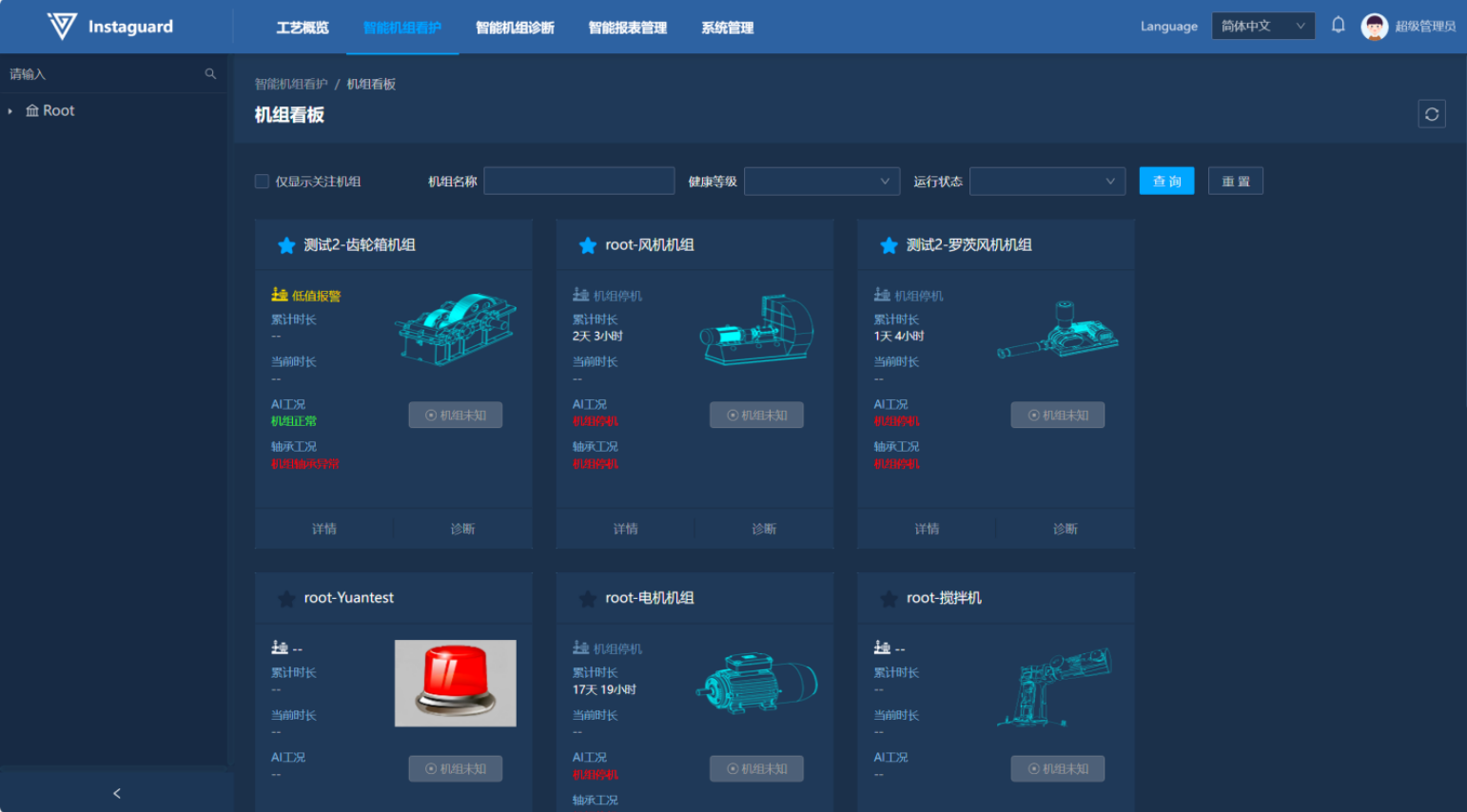 使用该功能完成对已看管机组的统一看护。看板内可以查看机组所属组织及机组名称,并展示机组机构、当前健康等级、累计运行时长、此次运行时长、机组实时运行状态,AI版可查看到最新AI看护诊断结果。看板支持根据机组名称、健康等级、运行状态快速筛选。