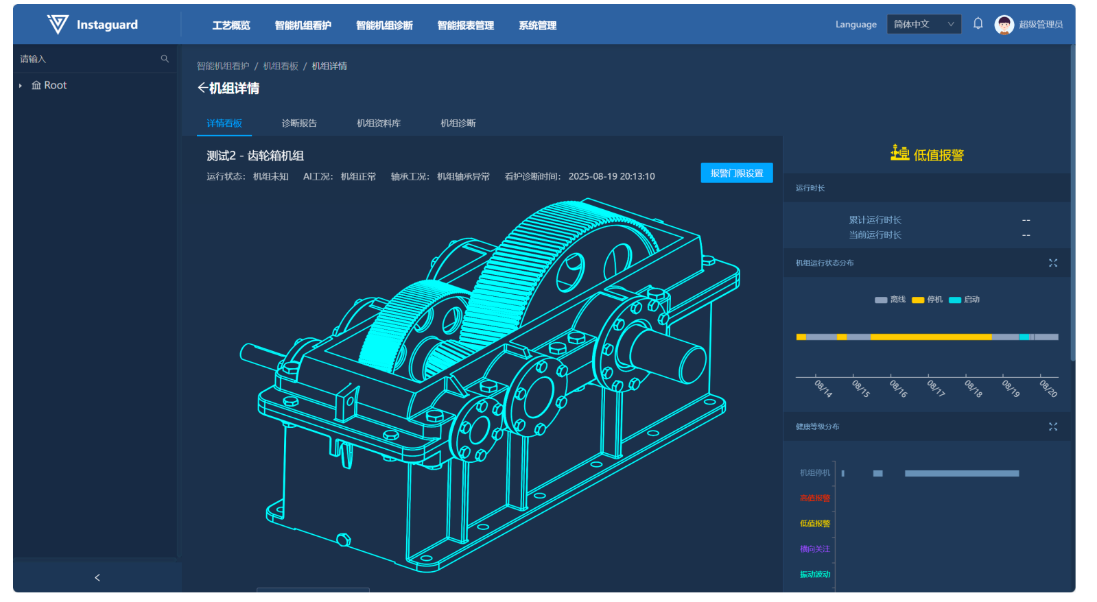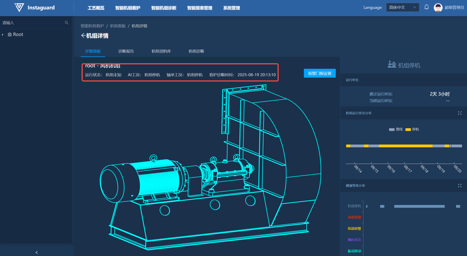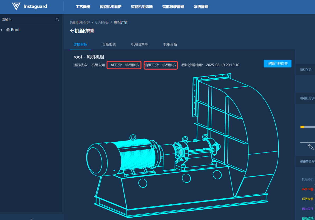 进入机组看板详情后,在详情内的中间区域可查看到机组机构,并可实时查看到机组当前运行状态,以及最新AI诊断结论