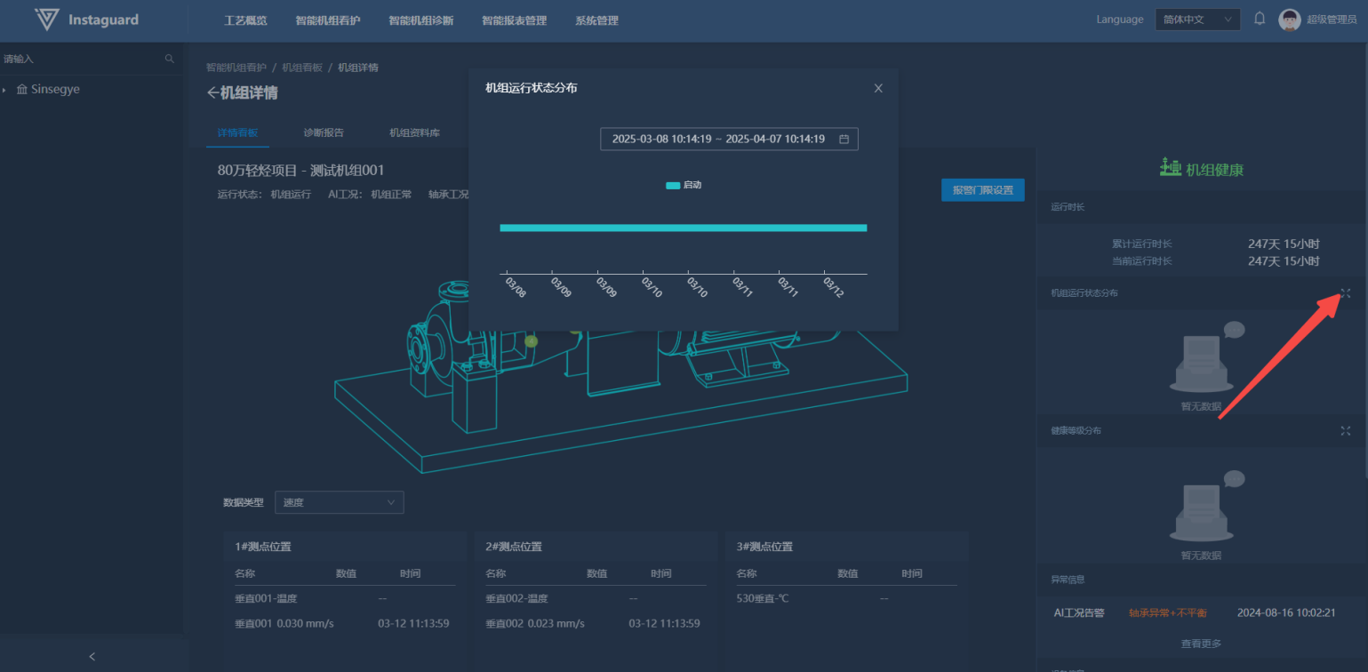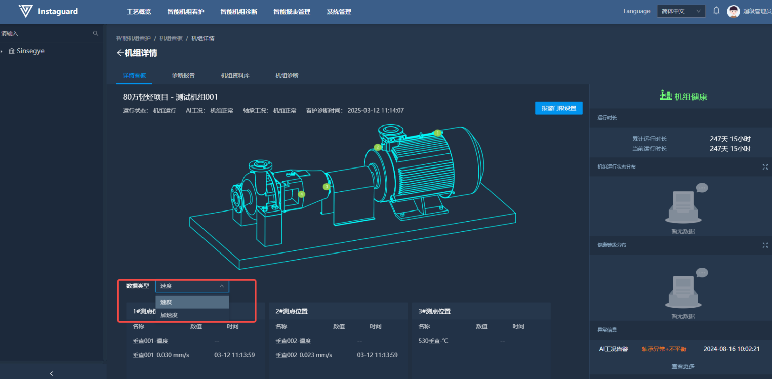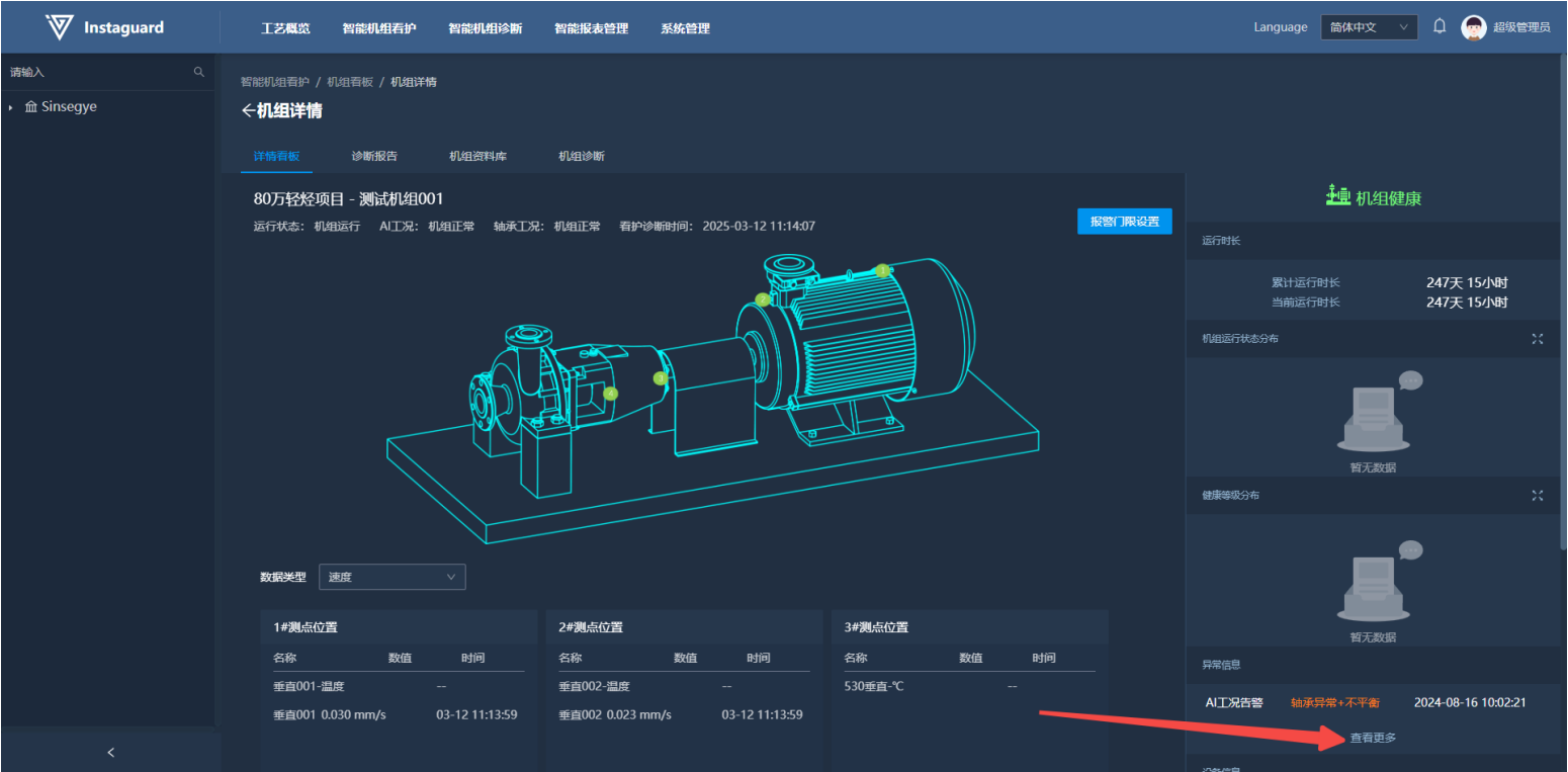 客户使用看板详情可以对指定机组进行全方位看护诊断。详情看板内,客户可以查看机组机构、测点安装示意位置。同时能够查看当前机组运行状态,AI版可查看最新AI看护诊断结果。