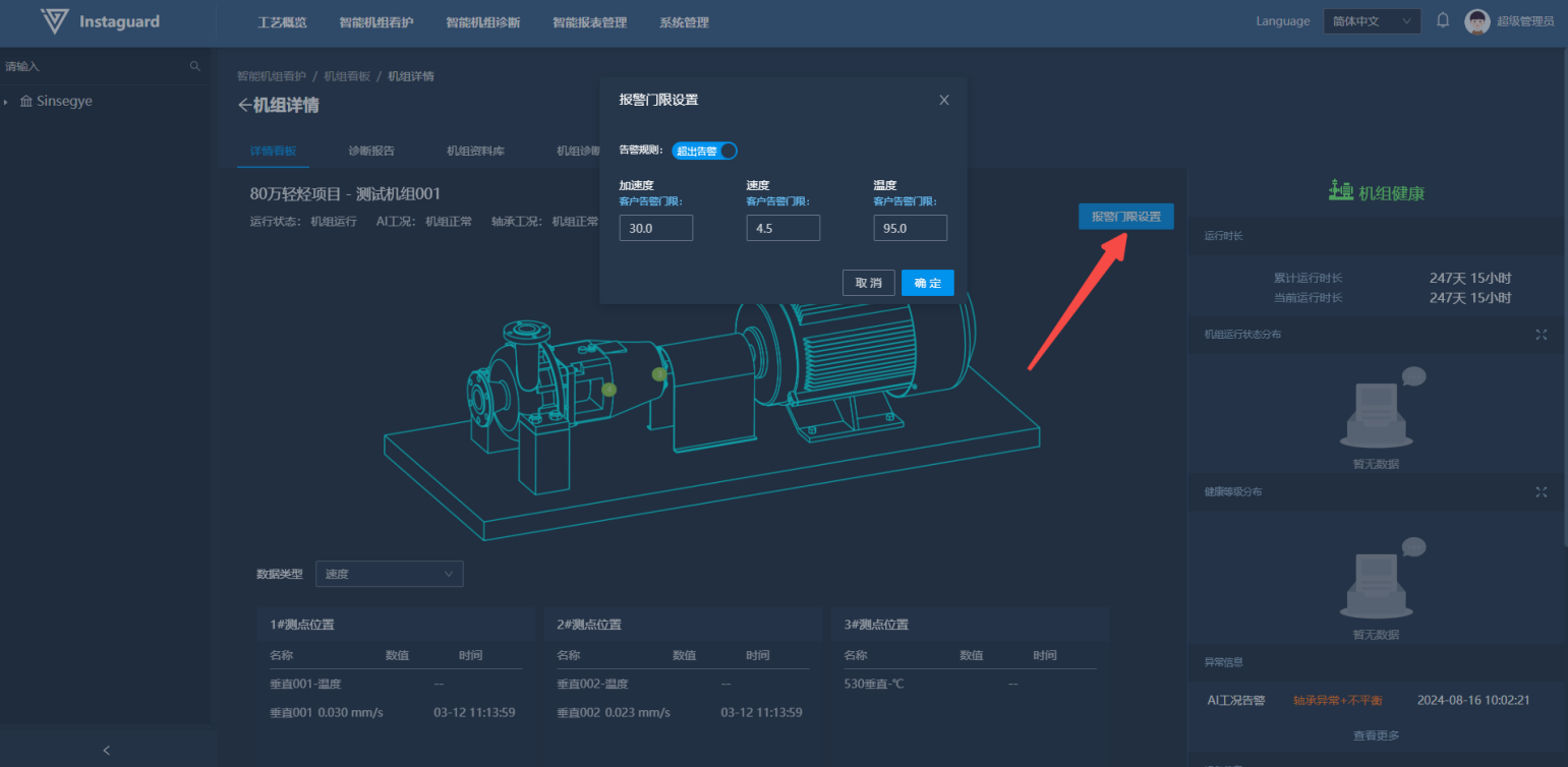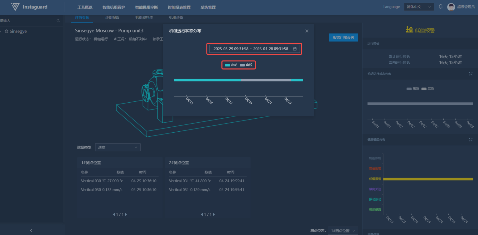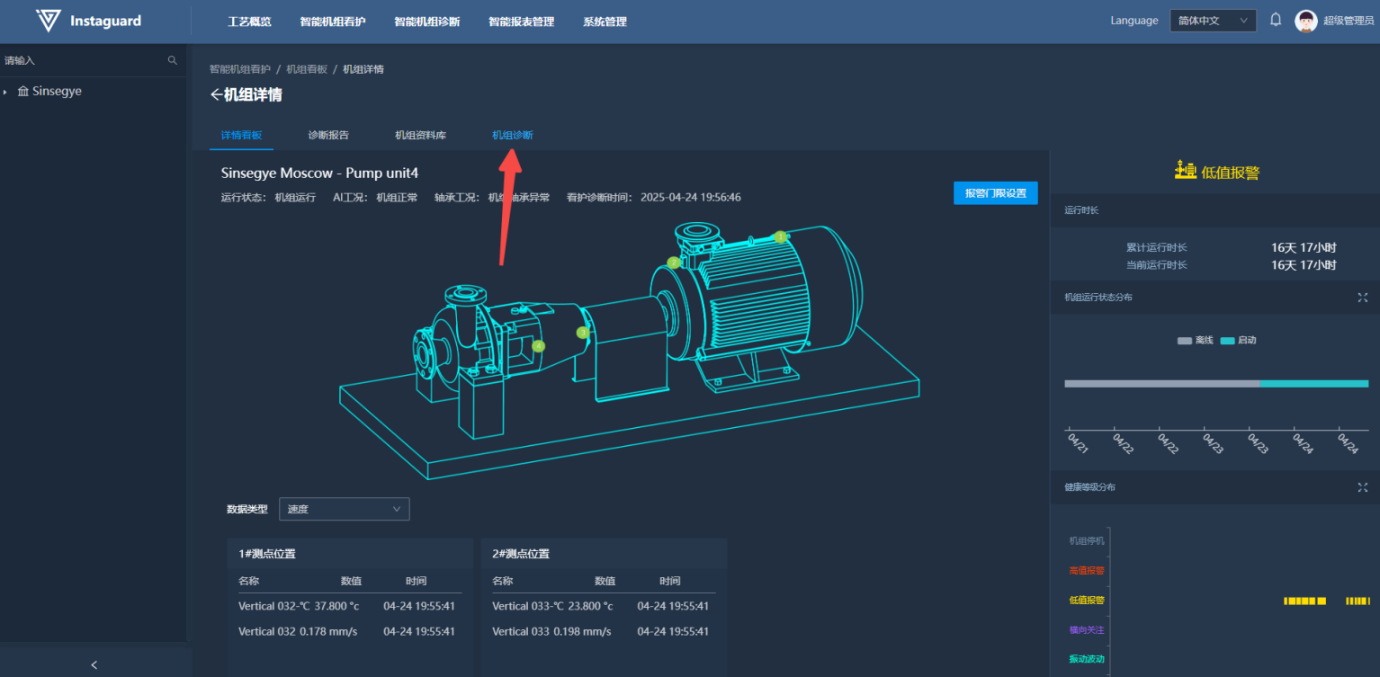 客户使用看板详情可以对指定机组进行全方位看护诊断。详情看板内,客户可以查看机组机构、测点安装示意位置。同时能够查看当前机组运行状态,AI版可查看最新AI看护诊断结果。