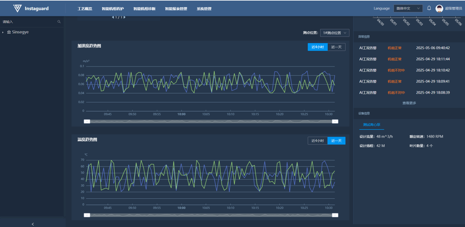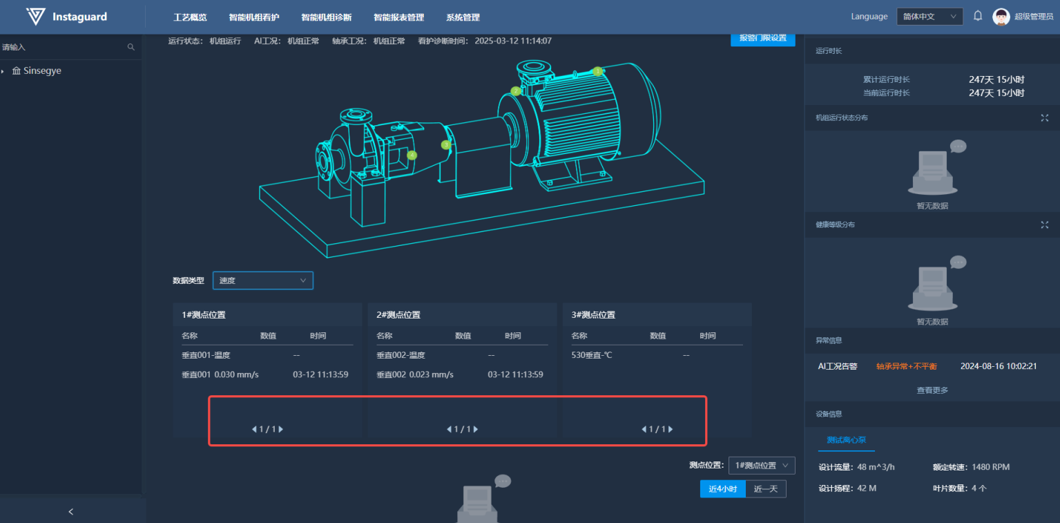 进入机组看板详情后,在详情看板下方可实时看到看护机组的最新特征数据,依据测点位置排列。各测点看板内,振动数据按照温度、测点Z轴、X轴、Y轴数据排列。并且数据可依据数据类型切换显示。当前数据类型可选择加速度、速度类型。