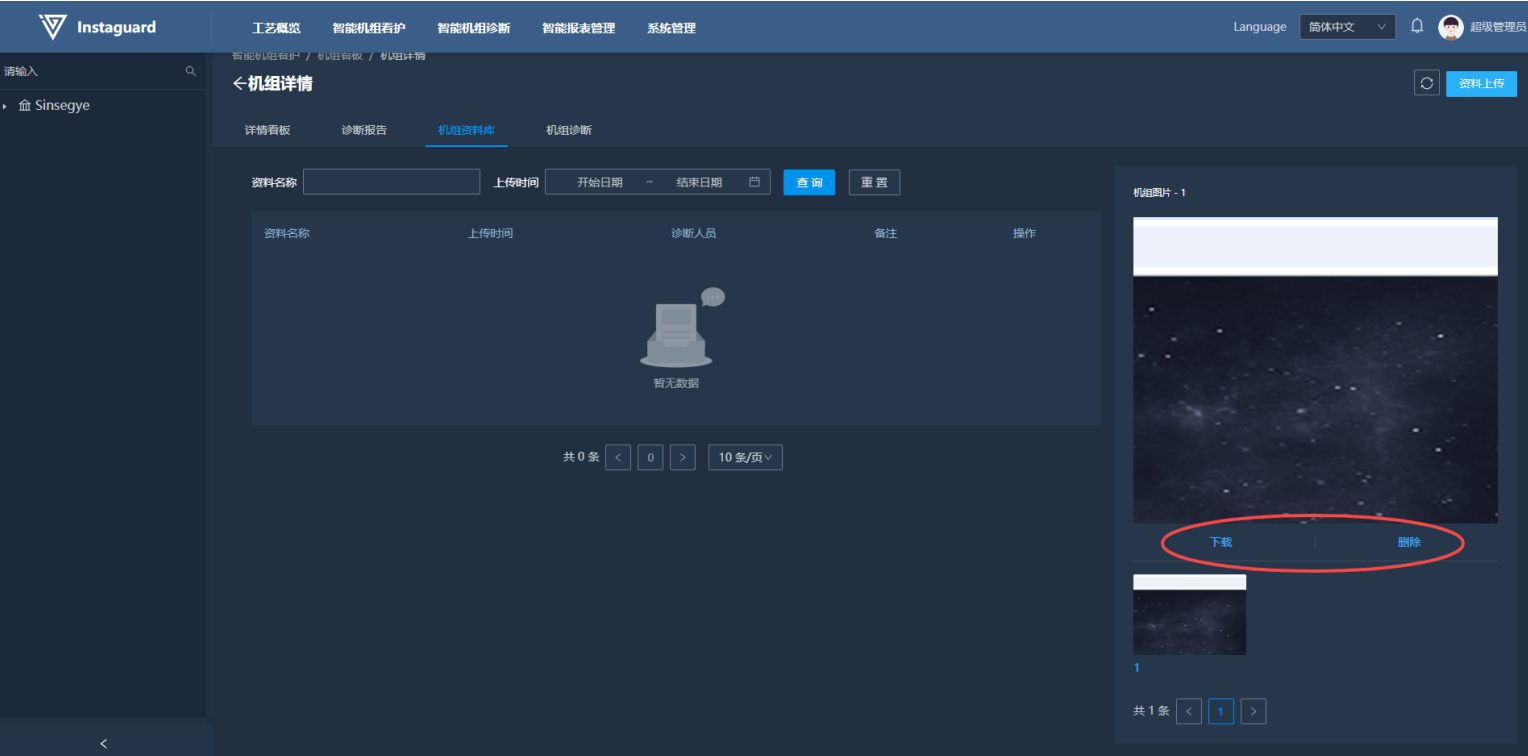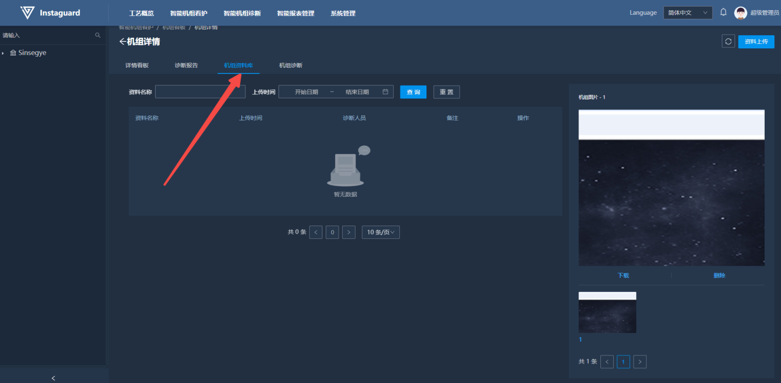 进入机组看板详情后,点击「机组资料库」按钮可跳转至该机组资料库。资料库内可查看用户人工上传各类关于该机组的相关文件、图片信息