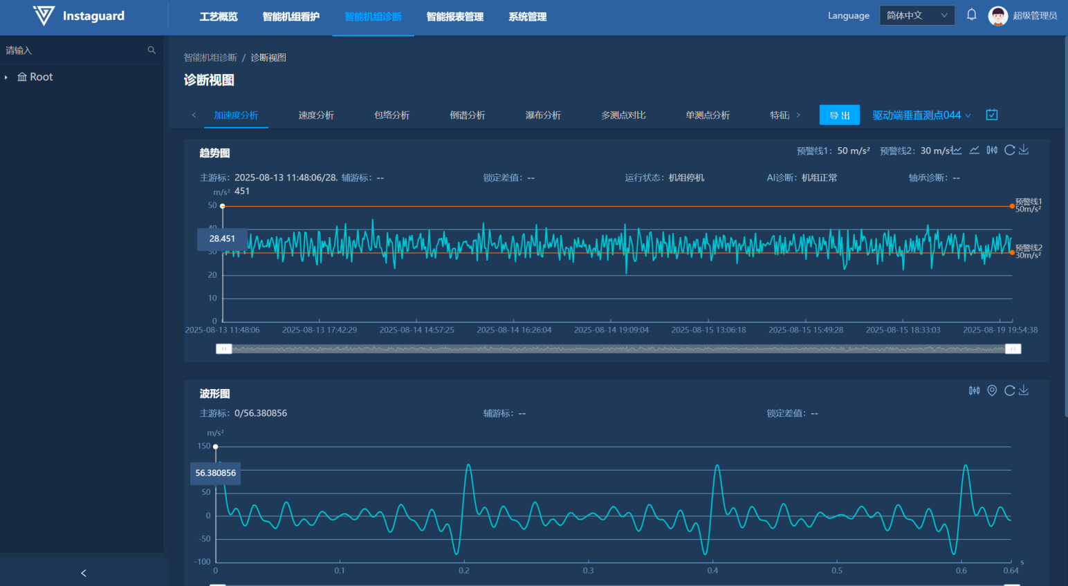 客户使用智能诊断视图可以对看护机组进行数据分析。诊断图谱提供加速度视图、速度视图、包络视图、倒谱视图、瀑布视图、单测点对比、多测点对比、特征趋势分析、运行趋势视图。视图内包含趋势图谱、波形图谱、频谱图谱。各图谱内支持快捷主游标设定、多游标快捷查看(两游标、三游标、五游标)、主辅游标差值查看、预警线查看等。趋势图内额外支持趋势点显示及隐藏。波形、谱图支持多点标注功能,可方便用户对同一图谱上的数据点位进行对比。各图谱均支持指定区域缩放及快速定位。