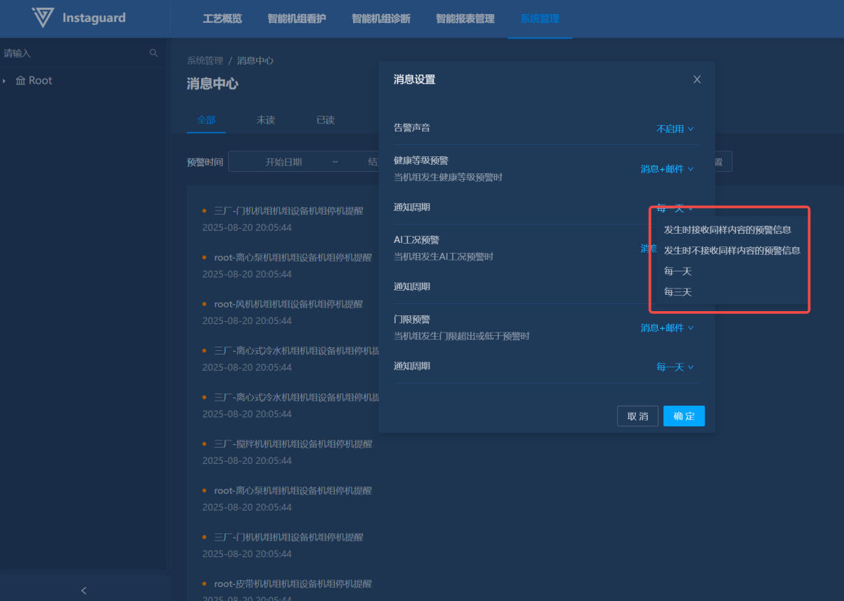 在消息中心可以对系统通知进行详尽的查看,并且可以根据用户需求设置通知的频率、方式以及通知的机组范围。