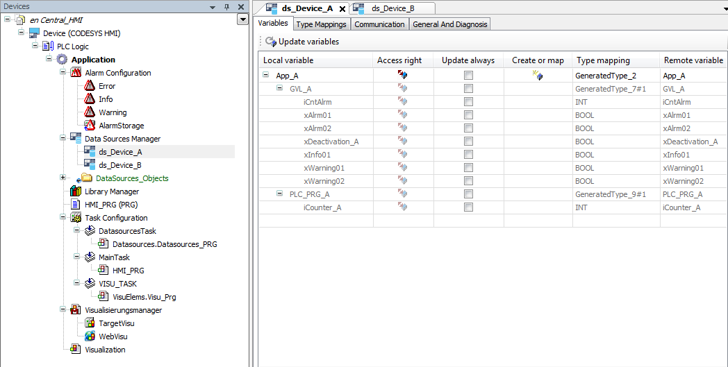 ⇒可通过数据源 ds_Device_A 和 ds_Device_B 连接到远程设备。现在可以扩展报警配置了。