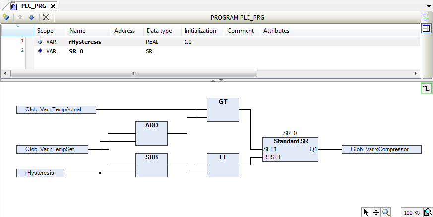 现在,您将在默认情况下创建的主POUPLC_PRG中描述应用程序的主要功能。当实际温度高于设定温度加上滞后时,压缩机被激活并冷却。当实际温度低于设定温度减去滞后时,压缩机关闭。