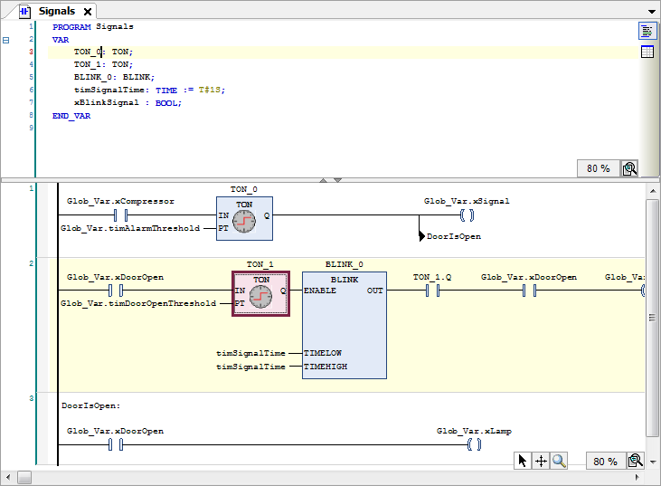 实现部分的监视取决于实现语言。 对于非布尔变量,该值始终位于标识符右侧的矩形字段中。 在ST编辑器中,这也适用于布尔变量。我们将此显示称为“在线监控”。在图形编辑器中,布尔变量的值由输出连接线的颜色显示(黑色表示FALSE ,蓝色表示TRUE):