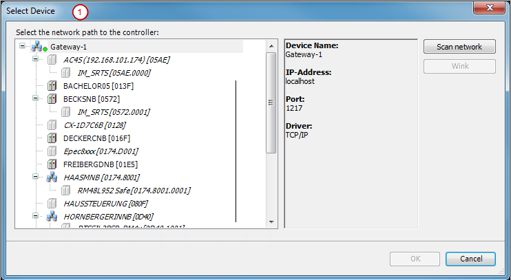 1.单击扫描网络以在本地网络中搜索所有可用设备。⇒此时会出现选择设备对话框(1),其中列出了可以与之建立连接的所有设备。