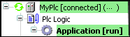 :PLC已连接,应用程序正运行,设备正运行,数据正在交换。在 PLC设置选项卡中的I/O更新停止 复选框中可被选择或清除。
