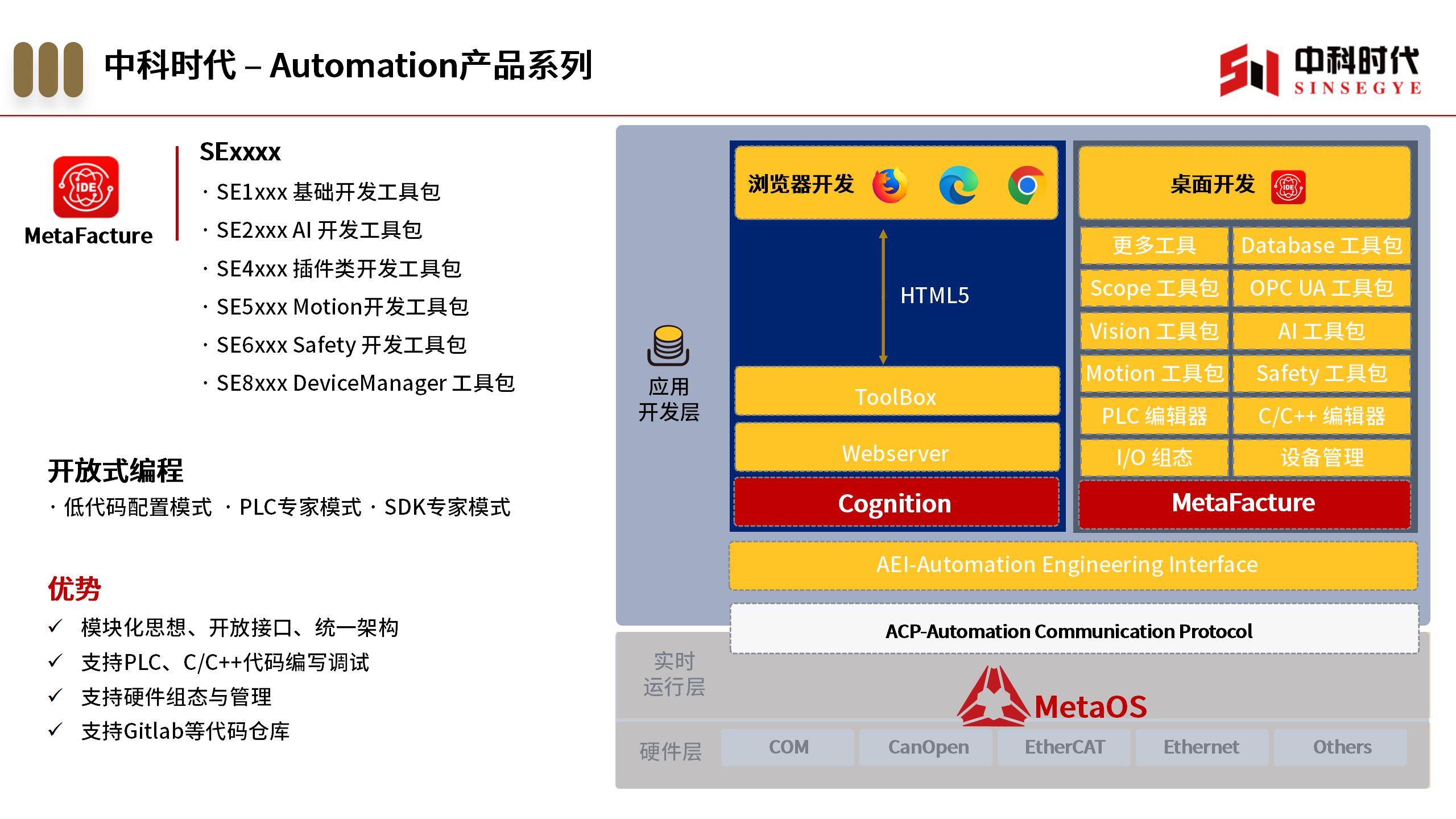 MetaFacture提供配置化模式、PLC专家模式、SDK专家模式三种编程模式,既支持创建专业的 IEC 61131-3 控制器应用,集成主机的标准功能,同时兼具面向对象编程的优势,又支持C/C++、Vision、AI编程,专为具有控制任务的自动化设备而设计。该系统为开发者提供多样化和优选的工程解决方案,以支持各种开发任务。项目配置过程通过简便的向导引导,使得用户能够轻松上手。