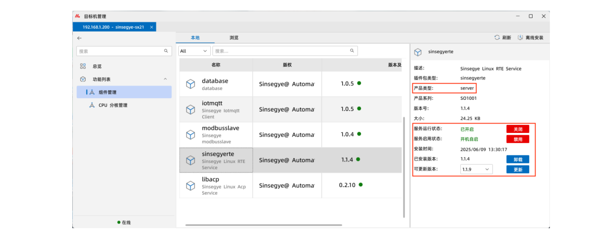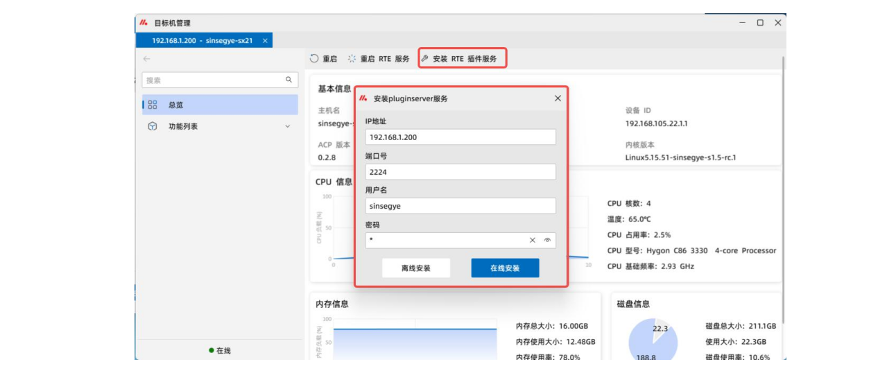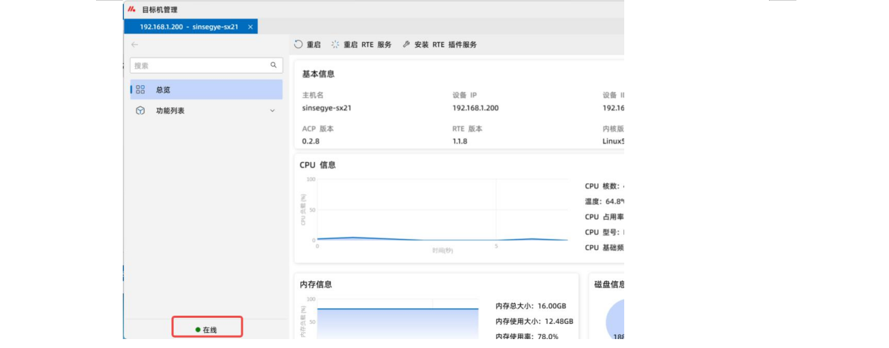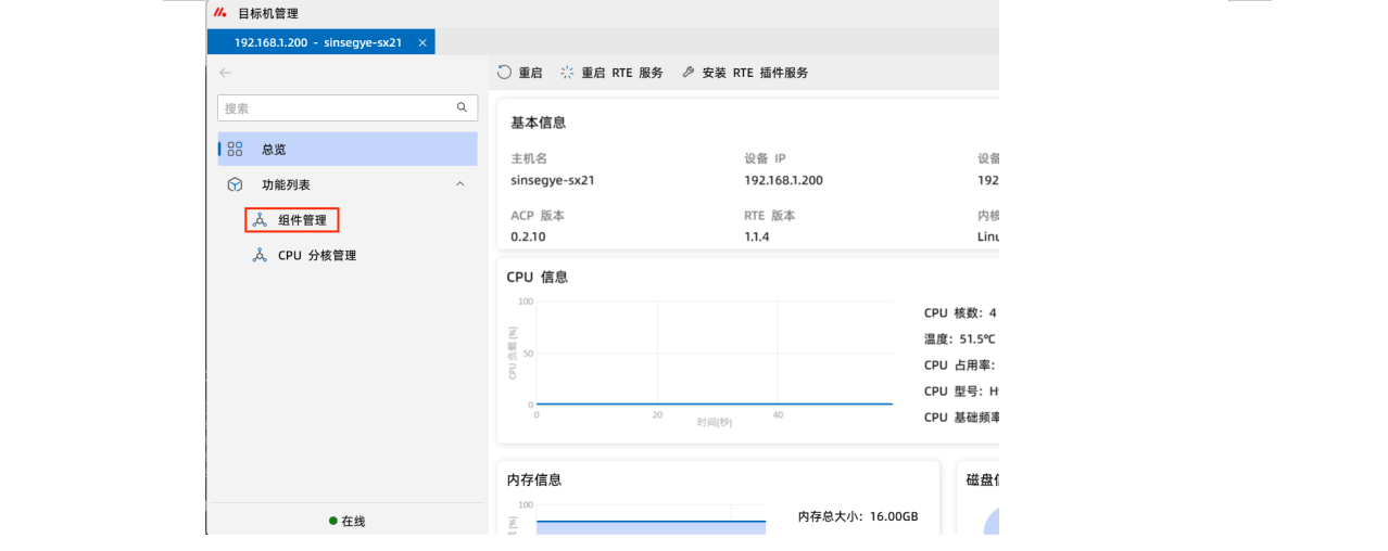 包括浏览工智机信息、CPU信息、内存信息、磁盘信息,重启RTE服务、CPU分核管理、在线安装组件和离线安装组件等功能。