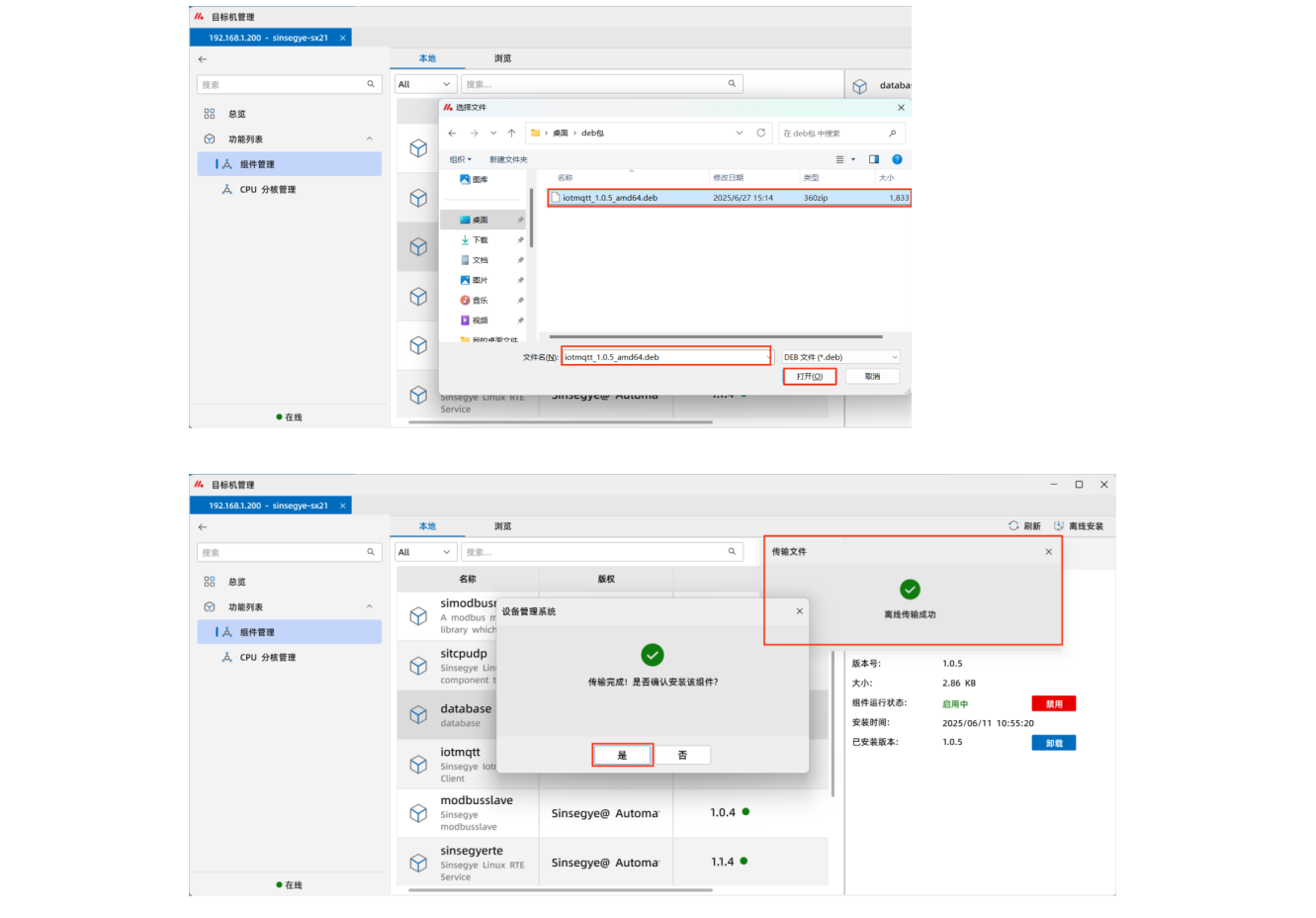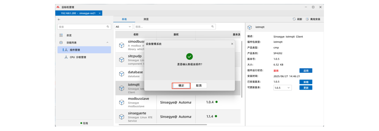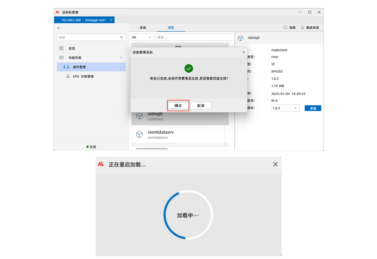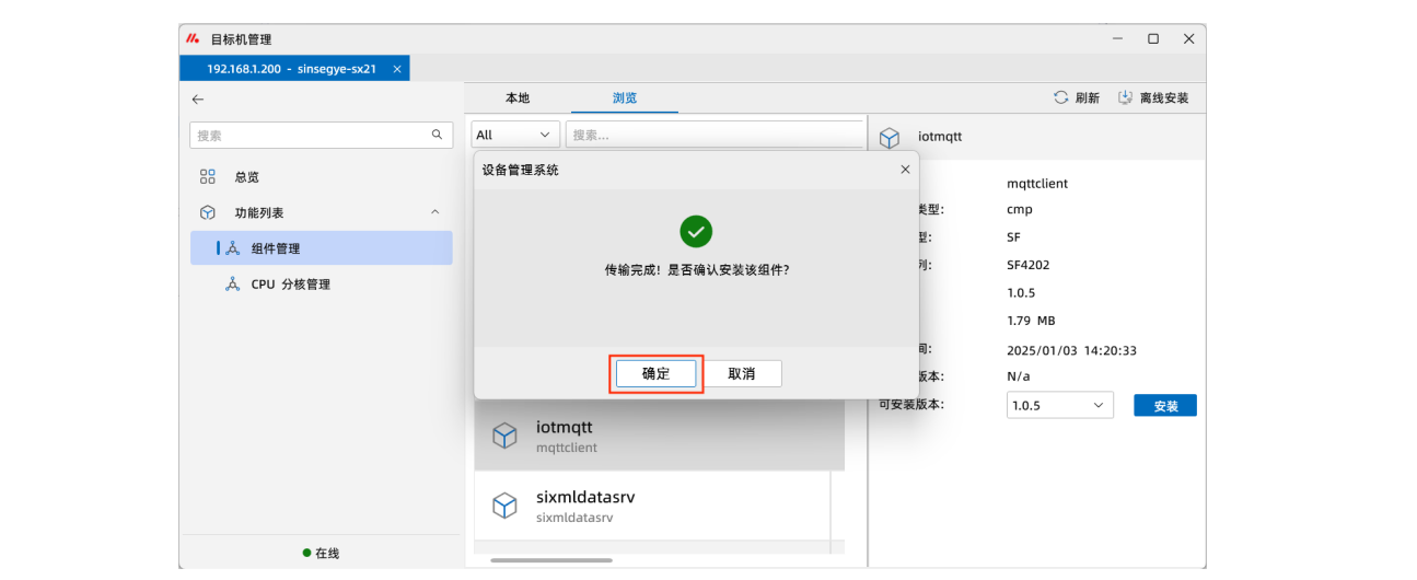 点击安装后,会先将组件传送至工智机,完成传送后,点击确认安装。