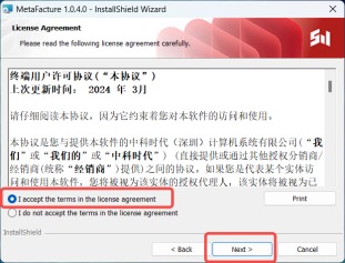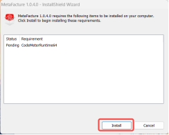 4. 然后根据安装助手的引导完成安装。如果您是首次安装MetaFacture,需要先安装依赖软件:点击【Install】(安装完成之后会启动CodeMeter,点击右上角关闭按钮关闭即可)