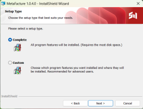 9. 选择安装方式,点击【Next>】:选择【Complete】会安装完整功能的MetaFacture(推荐安装方式)。也可以选择【Custom】, 安装部分功能。