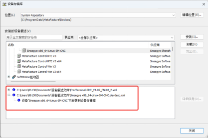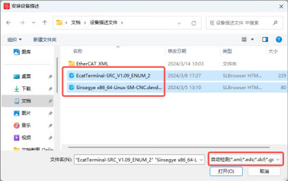 找到存放设备描述文件的目录,右下角的文件检测类型选择【自动检测】,选择SX5工智机设备描述文件"Sinsegye-x86_64-Linux-SM-CNC.devdesc.xml" 和 SRC8200设备描述文件”EcatTerminal-SRC_V1.09_ENUM_2.xml“,点击【打开】,即安装成功。