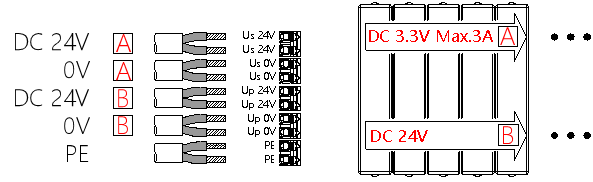 SC系列模块和信号分配板的Us与Up采用分离设计,需要分别为Us何Up提供24V电源供电。