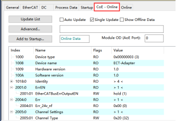 | 2001:01 | EtherCATBusErrOutputEN | 参数用于设置模块通讯断开后,输出通道的动作设置: 0:输出保持50ms后清除; 1:输出保持; 2:输出保持10ms之后清除; 3:输出保持20ms后清除; 4:输出保持100ms后清除; 5:输出保持500ms后清除; 6:输出立即清除; |