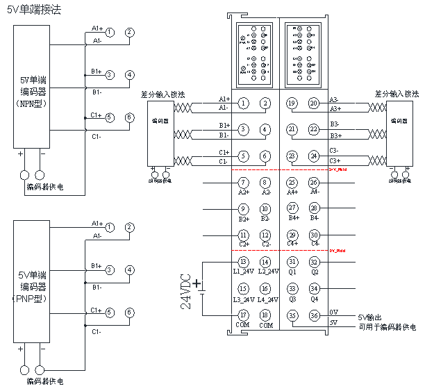 注:L1,L2,L3,L4为24V单端输入通道,Q1~Q4为NPN型输出通道,图中接线示例仅代表差分以及单端接法,不是指每个通道只能限于图中接法。