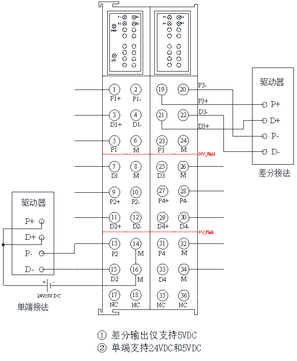 | P1+ | 轴1差分输出,脉冲正信号 |
