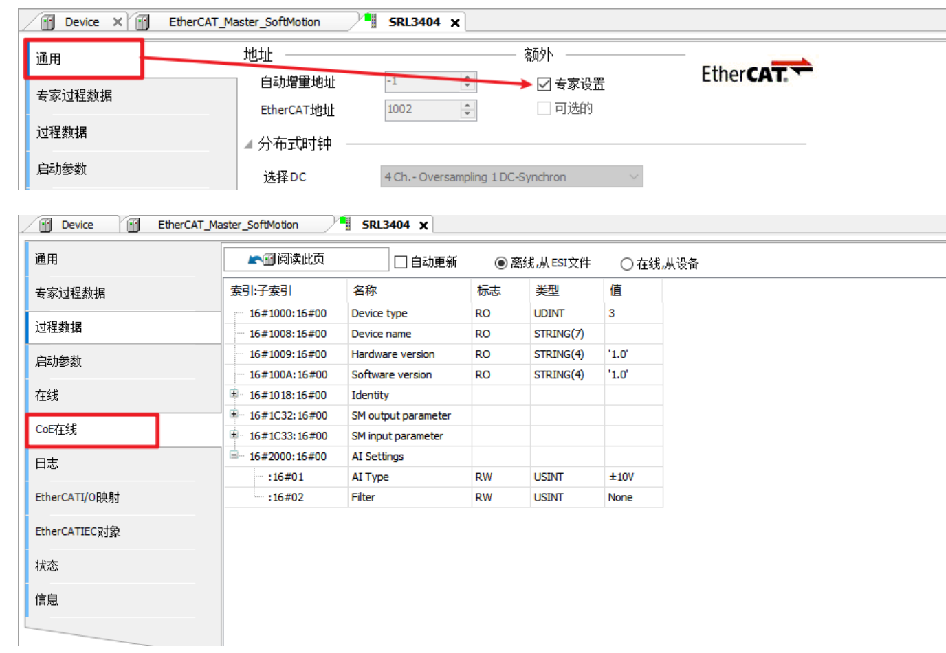 离线状态在通用参数中勾选专家设置,勾选完成后在线,可通过COE在线参数中修改模块参数。