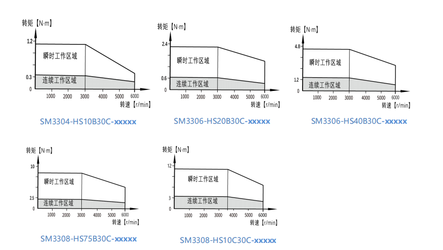| 电机规格 | SM3304-HS10B30C-xxxxx | SM3306-HS20B30C-xxxxx | SM3306-HS40B30C-xxxxx | SM3308-HS75B30C-xxxxx | SM3308-HS10C30C-xxxxx |