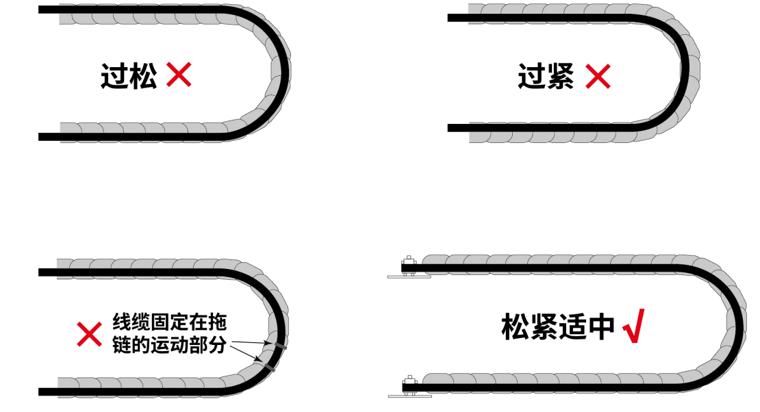 为了确保拖链在运动状态中保持平衡,分配在拖链上的电缆重量尽可能的均衡;建议较重的电缆位于两边,较轻的电缆位于中间。