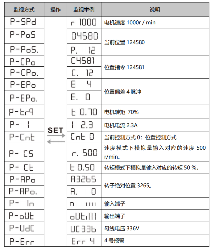 在第一层中选择“dp-- ”,并按SET键进入监视方式。共有 23 种显示状态,用户用 、键选择需要的显示模式,再按SET键,就进入具体的显示状态了。