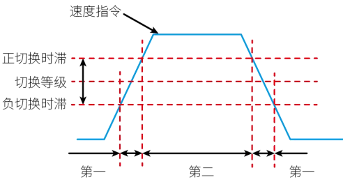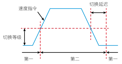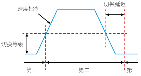 0:第一增益固定 (PS) 1:使用外部DI进行切换 (PS) 2:转矩指令大 (PS) 3:速度指令大 (PS) 4:速度指令变化率大 (PS) 5:速度指令高低速阈值 (PS) 6:位置偏差大 (P) 7:有位置指令 (P) 8:定位未完成 (P) 9:实际速度 (P) 10:有位置指令+实际速度 (P) |