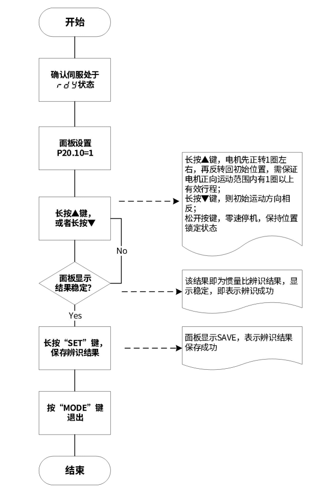 惯量辨识自动识别方法:通过操作伺服驱动器面板上的按键使电机运动,实现惯量辨识,无需上位机的介入;