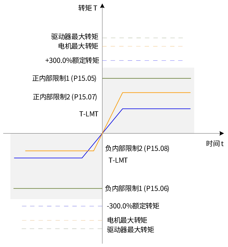 正转矩限制值由P15.07设定 负转矩限制值由P15.06设定 |