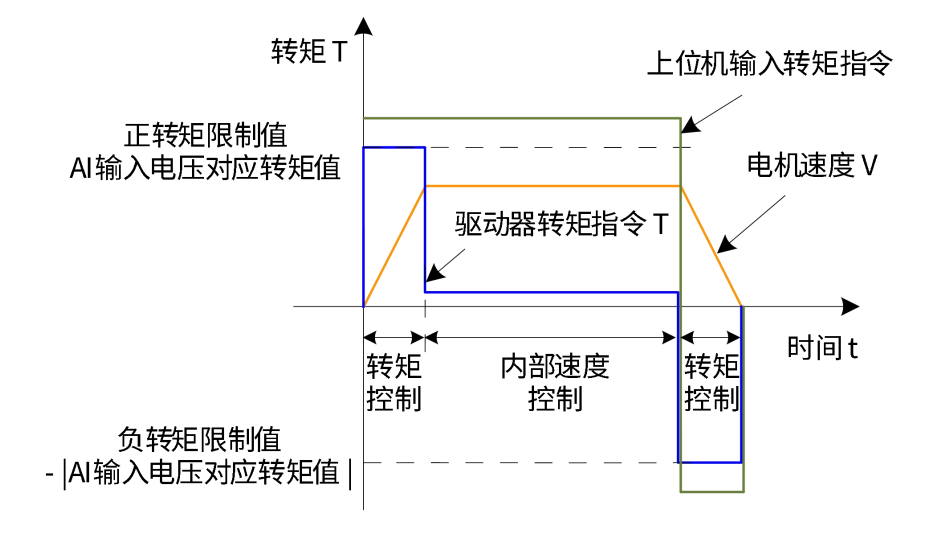 外部DI信号(FunIN.14)逻辑无效时,正转矩限制值由外部AI端子输入电压对应的转矩值决定;
