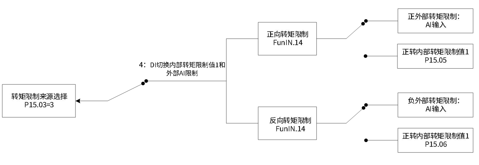 外部DI信号(FunIN.14)逻辑有效时,正转矩限制值由功能码P15.07和AI端子输入电压对应的转矩值中的较小值决定。